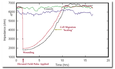 典型的損傷修復實驗如下圖所示。BSC1細胞首先長成單細胞層,然后兩個孔中給予點擊,使測量電極上的細胞死亡,引起阻抗值降低。隨時間的延長這兩個曲線又回到初始數值,這是由于那些在電極外的正常細胞向損傷地區遷移并重新生長并且替換已死去細胞。