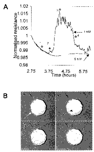 A:以葉酸為趨化化合物,少量NC4A2細胞從電極板一側(左下)遷移(右上)測量到的細胞層電阻值變化。由圖可見,隨著細胞進入電極孔范圍,電阻值上升,隨著細胞進一步遷移出電極孔,電阻值又下降